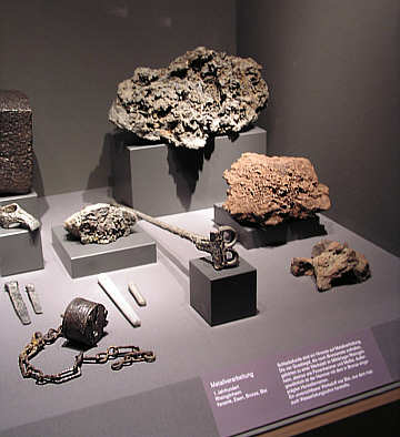 Eisenschlacken sind ein wichtiges Indiz für Metallverhüttung. Vorne links ein Dosenschloss mit Kette.