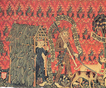| Wildleute sind ein beliebtes Motiv der oberrheinischen Bildteppiche und symbolisieren das Leben im Einklang mit der Natur ohne die Bindung an die moralischen und gesellschaftlichen Normen der Menschen. Zeichen ihrer Wildheit sind die langen, ungebändigten Haare, der fellbedeckte Körper und das fehlende Schuhwerk. Eine Typisierung dieser Wesen ist ebenso wenig möglich wie eine einheitliche Interpretation. Sie können als Metapher für wildes menschliches Verhalten stehen wie für die Offenheit zur Läuterung oder den Einklang mit der Natur. | |||||