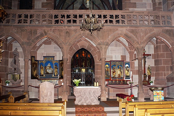 Darunter: Der spätgotische Lettner mit den beiden Flügelaltären