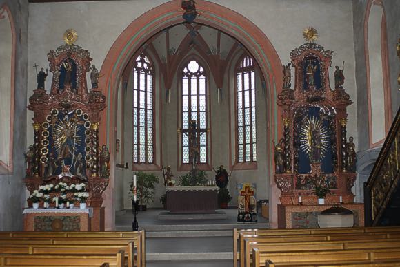 Saal, der in einen schönen, netzgewölbten Chorraum übergeht.