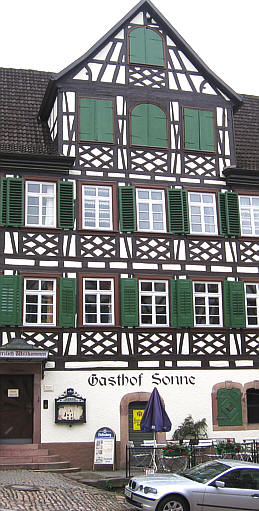 Das eindeutigste Beispiel für den Gestaltungswillen der Zeit, in der der Marktplatz neu aufgebaut wurde, ist das Gasthaus zur Sonne. Anscheinend standen an dieser Stelle ursprünglich zwei Häuser. Dadurch, dass nun auf beiden Bauplätzen zusammen ein Haus aufgebaut wurde, entstand eine lange Frontbreite, die jetzt zu dem zwang, was wohl auch der Zeitgeist verlangte, zu einem Haus, das traufseitig zur Straße gestellt wurde. Um den dadurch entstehenden starken Gegensatz zu den Nachbarhäusern zu mildern, wurde auf das Dach ein Zwerchhaus mit Giebel aufgesetzt. Das Fachwerk überzieht nun in gleichmäßigen Achsen wie ein reiches Flechtwerk die ganze Hauswand.