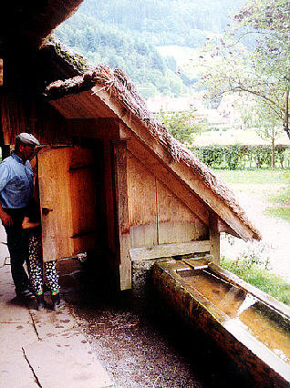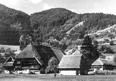 dem gemauerte Küchenteil des Vogtsbauernhofes in der Mitte
