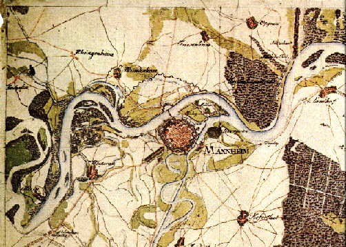 Mannheim und der unregulierte Rhein 1797 auf der Schmittschen Karte von Südwestdeutschland (Kriegsarchiv Wien) | ||||||||