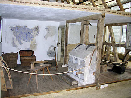 Blick von außen in die Stuben. Innen Geräte aus der Landwirtschaft und dem Nebenerwerb.