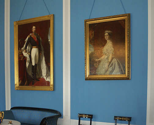 Im Bild oben links an der Wand das Porträt der Hortense, der Tochter Josephines, der Gemahlin Napoleons I., aus deren erster Ehre mit Alexandre de Beauharnais. Rechts davon das Porträt der Letizia Bonaparte, der Mutter Napoleons I.