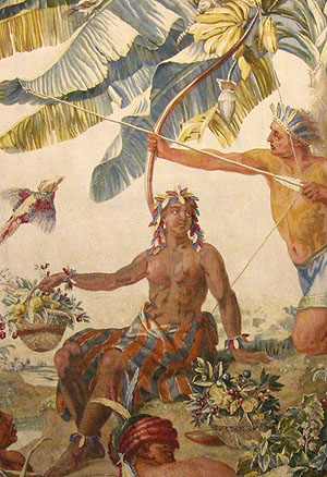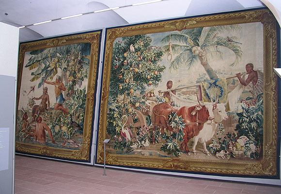 Die Cartons sind Werke des Landschafts- und Tiermalers François Desportes, der 1741 eine ältere Indien-Folge durch neue Vorlagen ersetzte. Einzelne Motve wurden dabei übernommen, aber in neue Zusammenhänge gesetzt. Die alte Indien-Folge geht auf eien Reise des Prinzen Moritz von Nassau 1637 nach Brasilien zurück. Denoch ist "Indien" dabei nicht eine bestimmte Kolonie, auch nicht im allgemeinsten Begriff "Neu-indien", also Mittel- und Südamerika. Die Szenen selbst geben auch keine realen Situationen wieder - "Indien" ist ein allgemeiner Begriff für das Exotische.