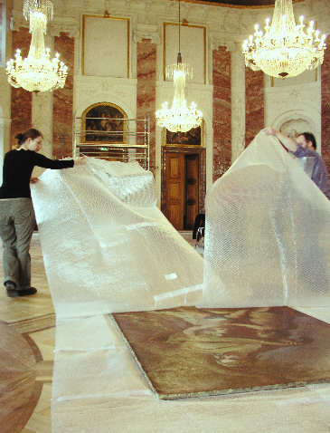 Nach Entfernung der Schutzfolie zeigt sich die Supraporte "Glück und Wohlstand" in frisch restauriertem Glanz.