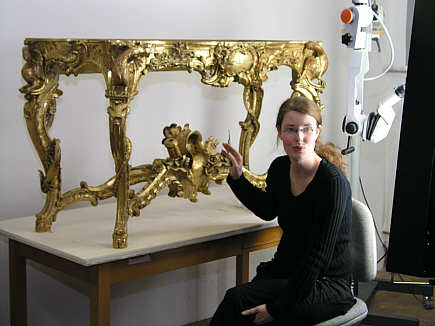 Monika Bürger im Badischen Generaldepot bei Restaurierungsarbeiten an einem barocken Konsoltisch