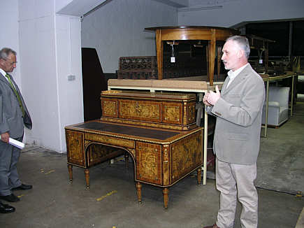 Oberrestaurator Wolfgang Wiese präsentiert einen originalen Schreibtisch des Kurfürsten Carl Theodor aus altem Mannheimer Bestand.