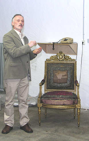Der Thronsessel aus badischer Zeit Das Stück wird trotz des verschlissenen Bezugs nicht restauriert, sondern nur gesichert