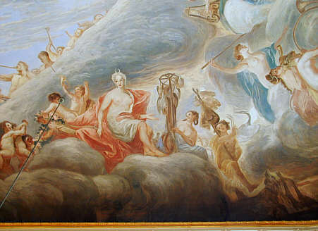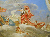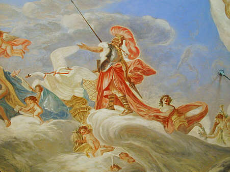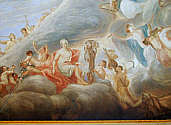 Die nicht eingeladene Eris, Göttin der Zwietracht, wirft den "der Schönsten" gewidmeten Apfel in den Saal, um den sich dann Juno (Hera), Minerva (Athene) und Venus (Aphrodite) streiten. Jupiter (Zeus) schickt Merkur (Hermes) zum Berg Ida, wo Paris das Urteil fällen soll (Szene im mittleren Feld des Treppenhauses).