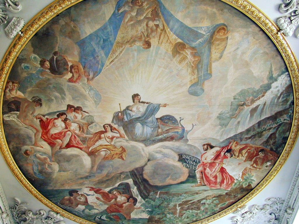 Seitenbild West: Juno befiehlt Aeolus, seine Winde gegen das Schiff des Aeneas zu schicken Unter einer von Putten gehaltenen baldachinartigen Draperie thront Juno mit ihren Pfauen, vor ihr Aeolus, der Gott der Winde. Die Naturgewalten sind durch die Gehilfen des Windgottes, die die Stürme anfachen (links unten), sowie die Berggötter, die die Fluten entfesseln und die Regengötter, die ihre Kannen ausgießen, dargestellt. (Bild im Großformat)