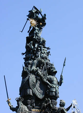 An der Spitze der Pyramide Saturn mit der Sense, der über den Lastern die Veritas (unter ihm) enthüllt. Diese hält ein goldenes Szepter mit einem Auge im Strahlenkranz.