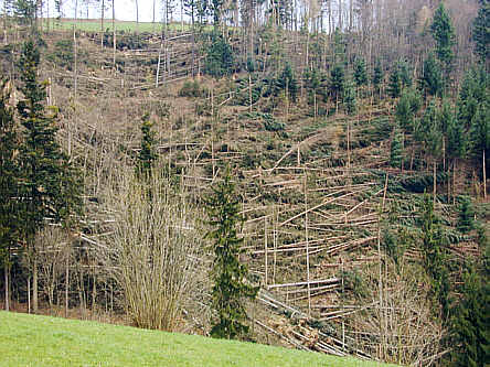 Kleinflächige Verwüstung eines Waldstücks durch den Orkan Lothar am 26.12.1999 |