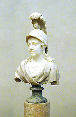 | Giuseppe Cerachi: Büste der Kurfürstin Elisabeth Auguste, um 1789 Die Kurfürstin wird hier als Minerva, als die römische Göttin der Weisheit, abgebildet. Im Gegensatz zu der parallel entstandenen Büste des Kurfürsten sind ihre Gesichtszüge sehr stark idealisiert. |