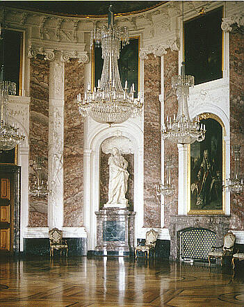 Residenzschloß Mannheim Der Rittersaal Nische im Rittersaal des Mannheimer Schlosses mit dem Standbild des Kurfürsten Carl Theodor Dem Kurfürsten gegenüber steht das Standbild der Kurfürstin Elisabeth Auguste.