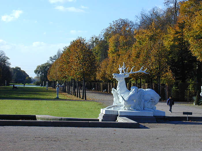 Aktäon, der von Diana zur Strafe in einen Hirsch verwandelt und von ihren Hunden zerrissen wird, ist eine Allegorie auf die Untergang der Sonne am Abend. Die Hirschgruppe steht daher im Westen des Gartenzirkels, während im Osten die beiden goldenen Figuren der Morgenröte stehen.