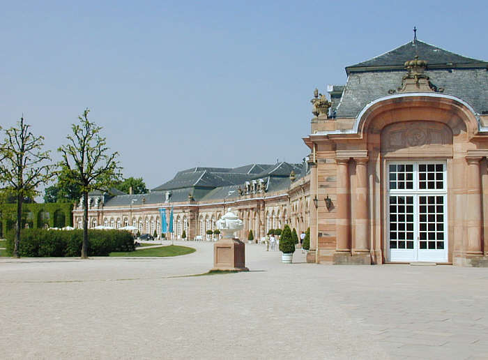 Viertelkreisförmige Gebäude zur Umfassung des Gartenparterres. Der nördliche Zirkelbau entstand als erster 1747/49 um den damals noch geplanten Jagdstern herum als Orangerie. Hinter dem Zirkelbau das Dach des 1753 eingeweihten Schlosstheaters.