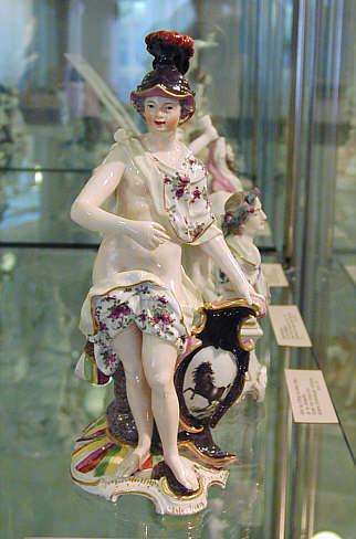 Europa Europa, eigentlich nackt und nur von einem leichten Tuch umschlungen, hält einen Schild, auf ihrem Kopf ein Helm mit Federwisch.