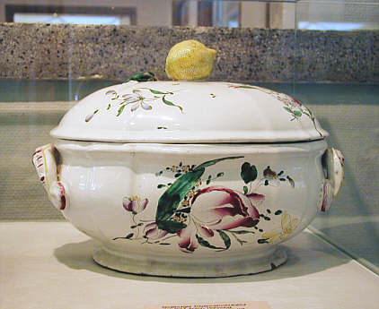 Große runde Deckelterrine mit Blumenmalerei im Holzschnittstil Fayence, Straßburg vor 1755