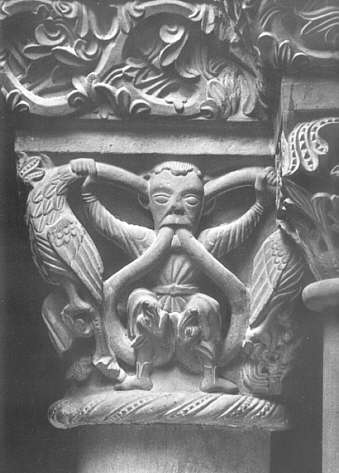 Der Lästerer - ein Mann wird von zwei Drachen durch Ohren und Mund durchdrungen (letztes Viertel 12. Jahrhundert)