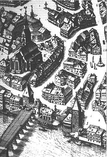 Links oben am Petersgraben liegt die Peterskirche, am rechten Bildrand der Fischmarktbrunnen Stich von Matthäus Merian