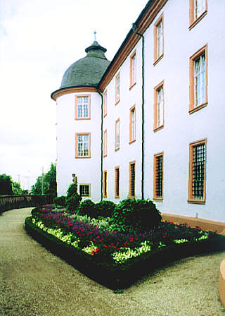 Das mittelalterliche Untergeschoss des "Hohen Turms" ragt in den Hof hinein, rechts davon steht in der Ecke ein Treppenturm mit Wendeltreppe zum Südflügel. Am Turm ein prächtiger Delphin-Wandbrunnen, 1612 von Johannes Schoch, dem Meister des Friedrichsbaus im Heidelberger Schloss. |