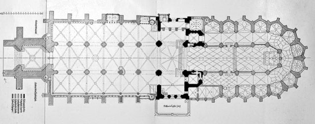 Der Grundriss des Münsters verdeutlicht die erhaltenen Reste des romanischen Gründungsbaus (schwarz), zeigt links daran anschließend das gotische Langhaus mit dem davor gestellten Turm sowie den im Osten (rechts) erneuerten und wesentlich über die ursprünglichen Maße des romanischen Chors hinaus gehenden spätgotischen Umgangschor.