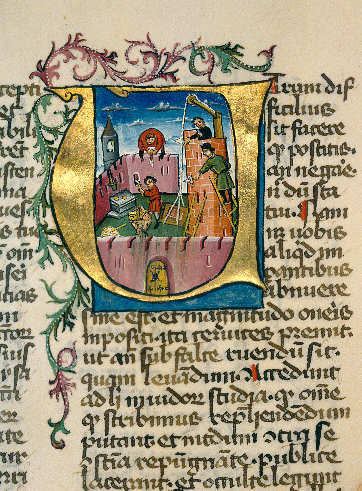 Initiale U mit der Darstellung einer spätmittelalterlichen Baustelle