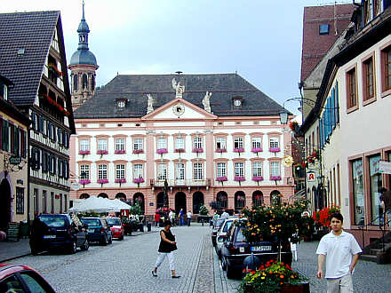 Hauptstraße und Marktplatz werden vom den barocken Rathaus der Freien Reichsstadt beherrscht. Im Hintergrund der barocke Turm der Klosterkirche.