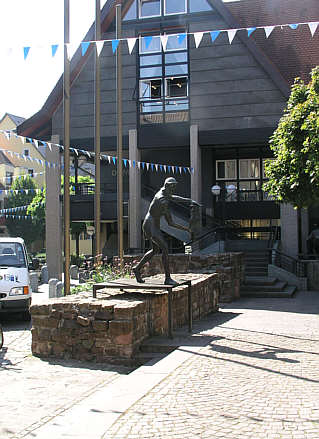 Teilrekonstruiertes Stück der römischen Kastellmauer, der weitere Verlauf ist im Straßenpflaster markiert.