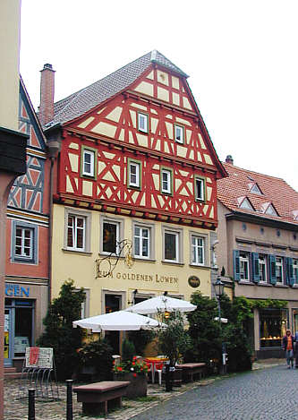 Dreistöckiges Stadthaus mit zwei steinernen, einem Voll- und einem Dachgeschoss in Fachwerk