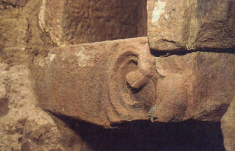 Die Spolie in der lagerichtigen Ansicht. Sie ist offensichtlich ein Segmentblock eines römischen Grabmals und war ursprünglich Teil der Inschrifttafel (Tabula ansata), bei der die Tafel von zwei nackten geflügelten Genien oder Eroten gehalten wird. Das Grabmal dürfte am ehesten als ein Pfeilergrabmal vom Typ der Igeler Säule (bei Trier) zu rekonstruieren und nach der Darstellung der tabulatragenden Eroten in das beginnende 3. Jahrhundert n. Chr. zu datieren sein. Das Grabmonument dürfte in der unmittelbaren Nähe der römischen Villenanlage gestanden haben, die unter der merowingerzeitlichen Kirche nachgewiesen wurde und stellt einen wichtgen Beleg dar für das ehemalige Vorhandensein römischer Steindenkmäler in der Ortenau. N. Krohn: Der Grabbau im Grabbau - eine bemerkenswerte römische Spolie in einem merowingerzeitlichen Adelsgrab in der Peterskirche zu Lahr-Burgheim. In: Archäologische Nachrichten aus Baden 59 (1998) S. 7 - 12 |