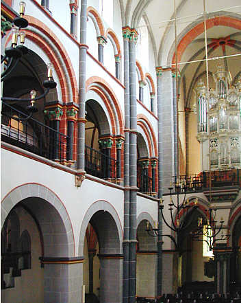 südliche Mittelschiffwand Vierzoniger Aufriss mit Seitenschiffarkaden, Emporengeschoss, blindem Triforium und Lichtgaden, nach dem Vorbild der französischen Frühgotik. Im Hintergrund die frühgotische Formen zeigende Orgelempore. |