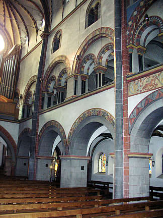 Langhaus nach Westen. Die Seitenwände des Mittelschiffs zeigen den typischen romanischen Aufriss mit Seitenschiffarkaden, Zwillingsaraden in den Emporen und kleinen Zwillingsfenstern im Obergaden.