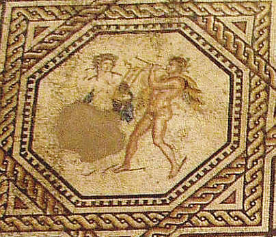 Tanzszene eines Satyrs mit einer Mänade. Die Mänade spielt auf einer Leier, der Satyr bläst die Flöte.