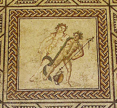 Bacchus/Dionysos stützt sich auf einen kräftigen jungen Satyr mit dem Thyrosstab in der Hand, am Boden liegt ein umgestürzter Weinbecher.
