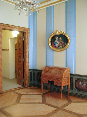 Appartement der Markgräfin Einfache Wandbespannung in blau und weiß, die den Eindruck der ehemaligen Ausstattung des Raumes mit reich mit Spitzen verziertem blauen Atlas wiedergibt. In diesem Raum, der unmittelbar vom Prunkschlafzimmer aus zugänglich ist, stand vermutlich das Schlafbett der Markgräfin.