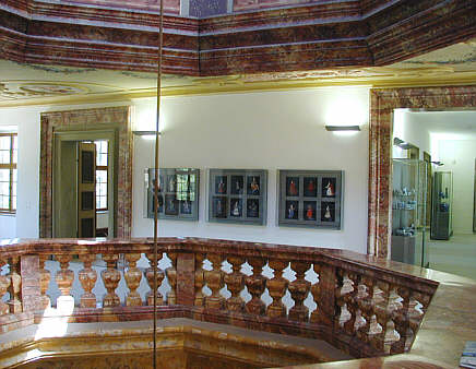 Von der Sala Terrena im Erdgeschoss bis zur Kuppel durchgehender Raum. An den Wänden Vitrinen mit den Kostümbildern der Markgrafen. Eingangsbereich für die Porzellansammlung im 2. Obergeschoss.