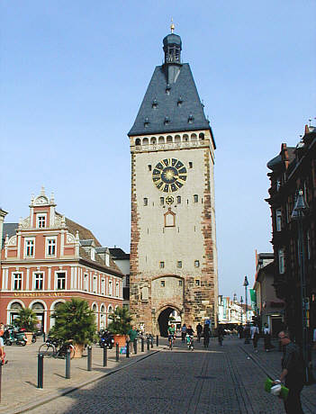Westliches Tor der Stadtbefestigung, gesehen von der Feldseite. Der untere Teil zwischen 1230 und 1250 erbaut, oberstes Stockwerk mit Umgang 1512/14 hinzugefügt.