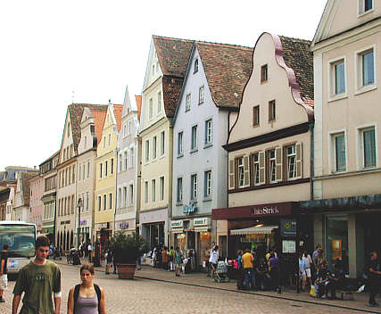 Barocke Giebelhäuser im mittleren Teil der Maximilianstraße, Blick nach Osten. Im Hintergrund die Engelapotheke