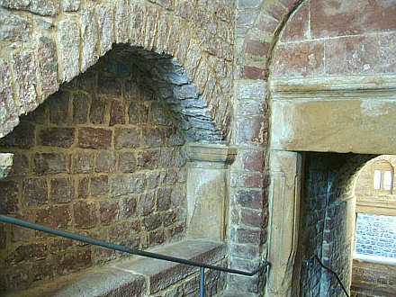 Sitzbank neben der Treppe, rechts das Zugangsportal und im Hintergrund der Vorraum