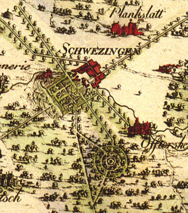 Detail: Schwetzingen mit Schlosspark, den beiden Querachsen und dem Jagdrondell im Wald.