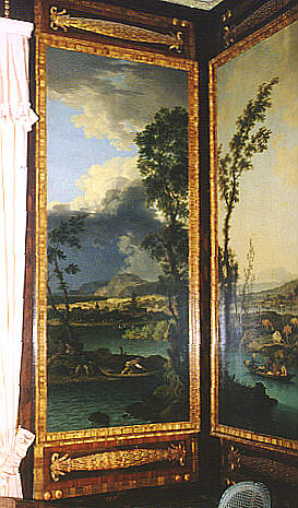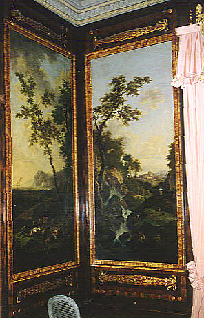 Das Arbeits- oder Schreibzimmer ist mit polierter Holzverkleidung (Boisserien) und  idyllischen Landschaftsmalereien von Ferdinand Kobell (1773 gemalt, 1774 oder 1775 ins Badhaus gebracht) ausgestattet.