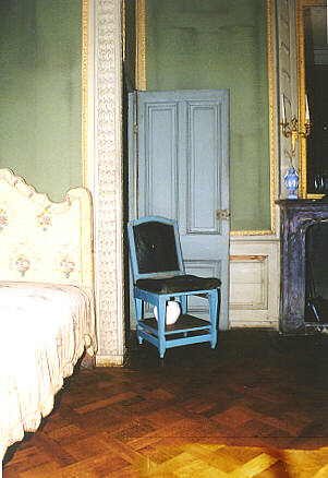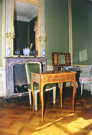 Der Raum war ehemals ausgestattet mit einer feinen Seidentapete im chinesischen Stil und zeigt Supraporten von Nicolaus Guibal. An der Wand befindet sich ein ein Spiegelarrangement. In der Ecke die Retirade mit dem Nachtstuhl.