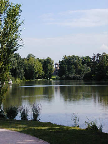 Am Ostufer des Teichs liegen breit hingelagert Figuren der Flussgötter Rhein und Donau, gegenüber waren zwei weitere Figuren pfälzischer Flüsse vorgesehen. Quer über den Teich hinweg geht die Sichtachse vom Merkurtempel zur Chinesischen Brücke.