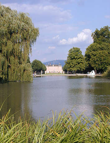 Den Abschluss des Gartens nach Westen bildet der Große Weiher in der Symmetrieachse des Gartens. Hintter ihm geht - von Garten aus gesehen - symbolisch die Sonne unter, ihn ihm solle sich der ganze Garten spiegeln. Er war ursprüngich rechteckig mit klaren Eingrenzungen angelegt. Die Einfassungen wurden jedoch im 19. Jahrhundert beseitigt, um das Becken dem englischen Landschaftspark anzugleichen.