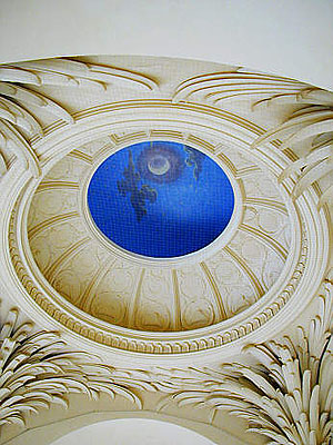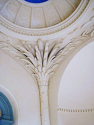 Die Eckpavillons sind mit bereits klassizistisch anmutenden Palmettenkapitellen verziert. In der angedeuteten Kuppel erscheint in einer kreisrunden Öffnung eine Mondsichel auf blauem Himmel.