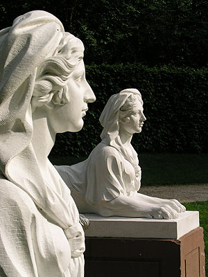 Drei Paare von Sphingen rahmen die drei Zugänge vom Oberen Umgang zum Zuschauerparkett ein. Sie stellen die vier Schauspielkünste sowie Wissenschaft und Macht dar. Ihre Gesichter sind individuell und sehr realistisch gestaltet. Wer Modell saß, ist unbekannt.