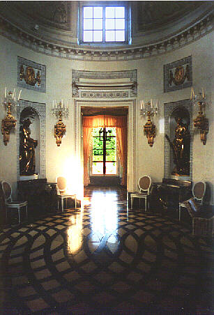SchwetzingenBadhaus im SchloßparkOvaler Saal als zentraler Eingangssaal. Von hier gehen nach Osten die Räume des Morgens: Arbeitszimmer und chinesisches Teezimmer, nach Westen die Räume des Abends und der Ruhe: Badezimmer und Schlafzimmer ab. Der Blick nach Osten weitet sich zu einem symmetrisch gestalteten Parkteil. In den vier Nischen stehen vergoldeten Allegorien auf die vier Jahreszeiten. Das Badhaus des Kurfürsten ist ein privater Rückzugsort mit allen Annehmlichkeiten, die der Kurfürst auch für einen längeren Aufenthalt benötigte: In der unmittelbaren Nachbarschaft befindet sich die kleine Badhaus-Küche sowie ein Freiluft-Theater für künstlerische Darbietungen und Zerstreuung. Hier konnte Karl Theodor die Strenge der höfischen Etikette abstreifen und sich ganz "privat" zurückziehen. Das Deckengemälde von Nicolaus Guibal (1772), Aurora besiegt die Nacht, wird derzeit restauriert. Orientieren Sie sich auf dem Grundriß des kleines Gebäudes |